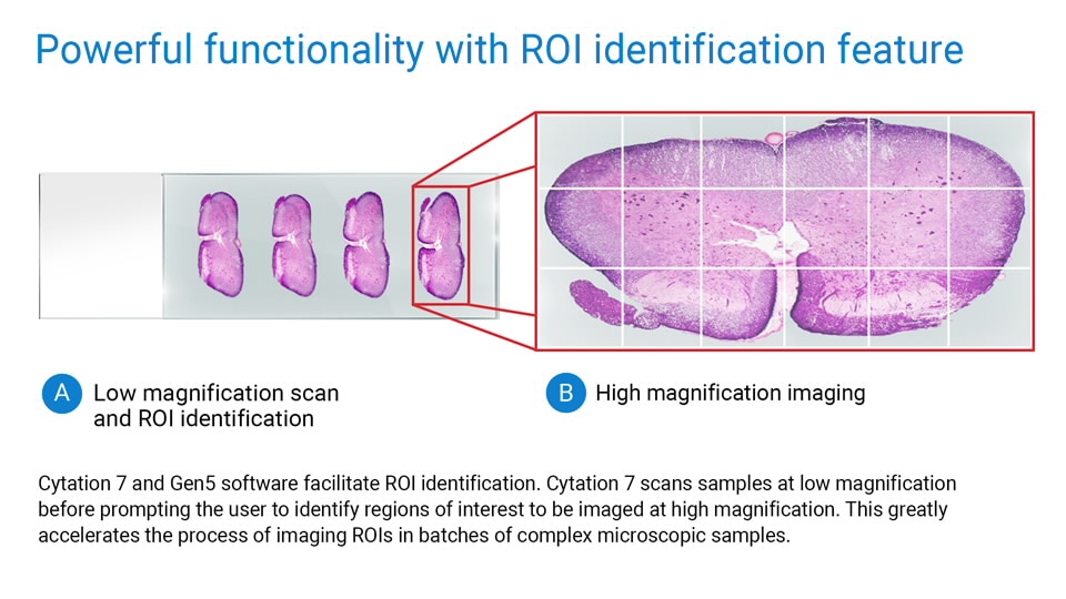 Cytation 7 및 Gen5 소프트웨어는 ROI 식별을 용이하게 합니다. Cytation 7은 사용자가 고배율로 이미지를 측정할 관심 영역을 식별하기 전에 저배율로 시료를 스캔합니다. 따라서 현미경을 이용해야 하는 복잡한 시료 배치에서 ROI 이미징 프로세를 통해 그 속도가 아주 빨라집니다.